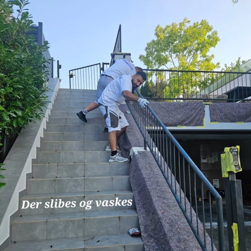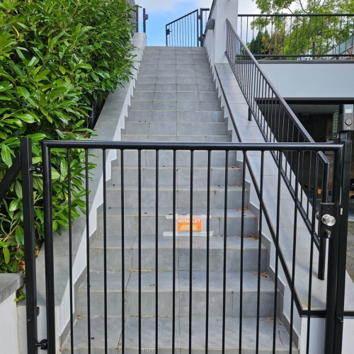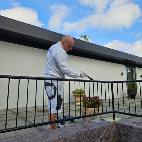Metalgelænder hos kunde i Klampenborg blev slebet og afrenset grundigt før behandling. Herefter blev det malet to gange med Combi Color i sort satin for en slidstærk og ensartet finish.